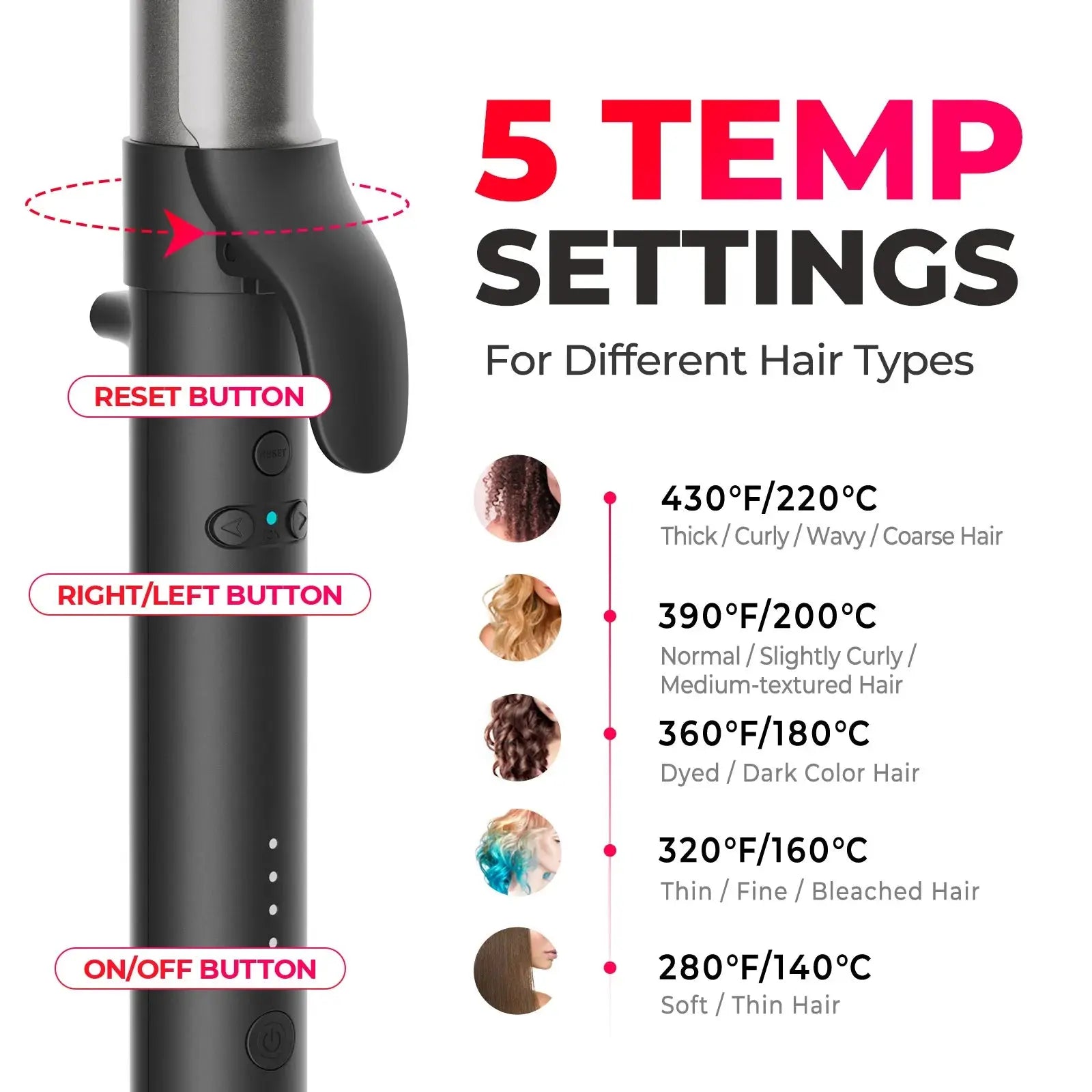 • 5 precise temperature options for different hair conditions (280°F – 430°F)