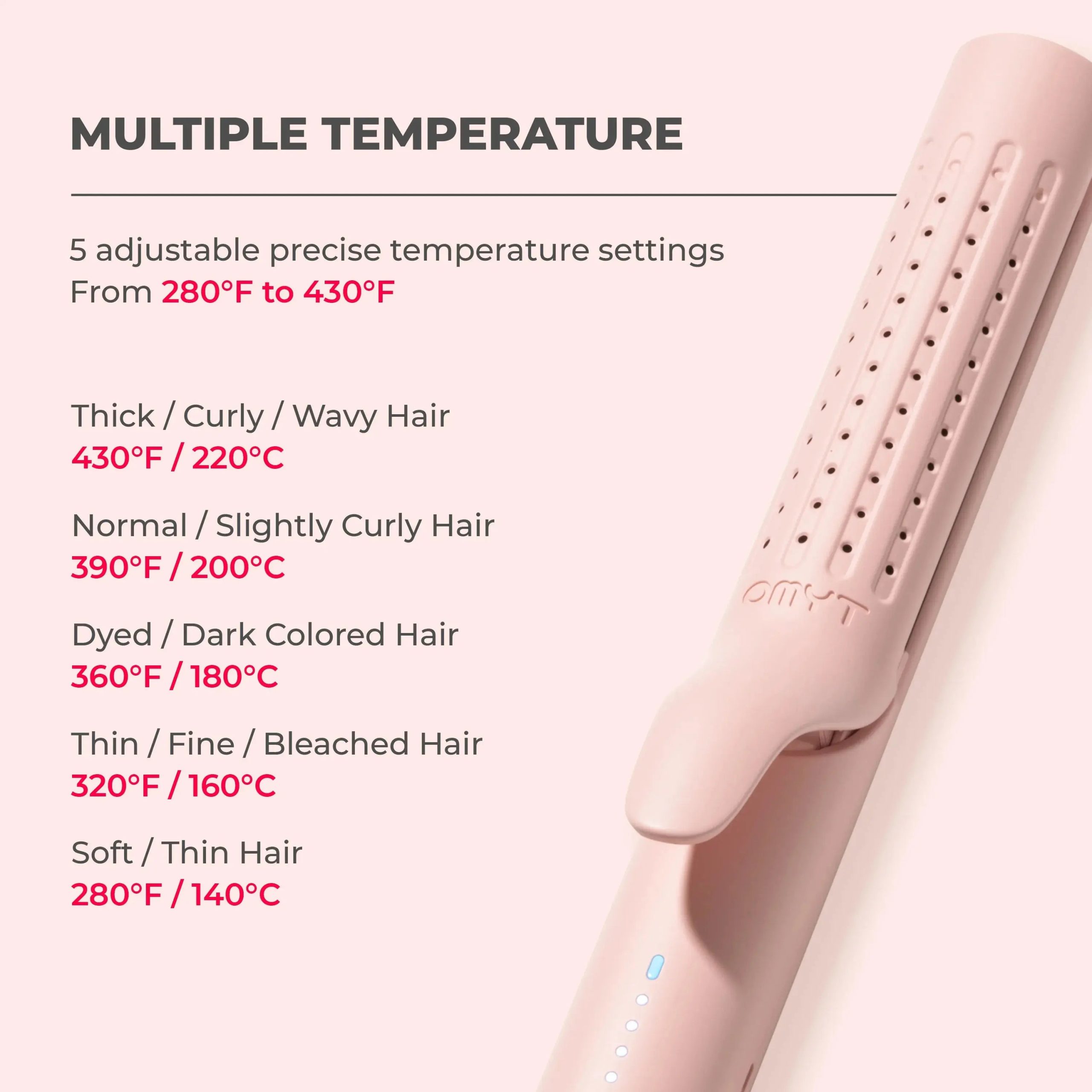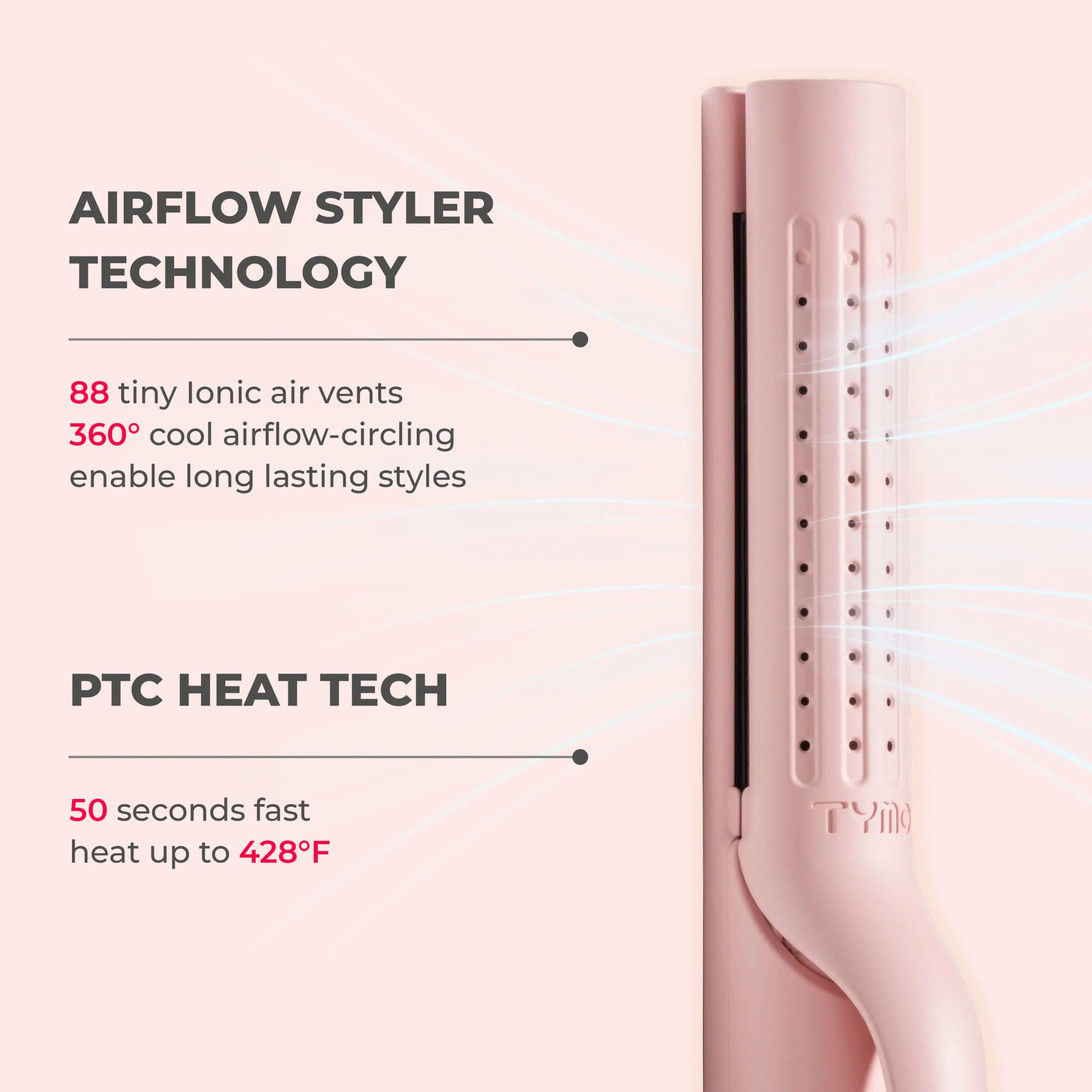 Experience revolutionary technologies with TYMO AIRFLOW PINK.  Symbolic 2-in-1 Hair Curler & Straightener designed for all hair types and easily creates bouncing curls and straight sleek looks in a matter of minutes! Unique floating V-shape opening featuring, 88 ionic tiny air vents with 360°cool airflow-circling can achieve long-lasting hairstyling in 5 adjustable temperatures. TYMO AIRFLOW brings technology, beauty and safety at the same time, enjoy the gorgeous salon-like finish from day to night!