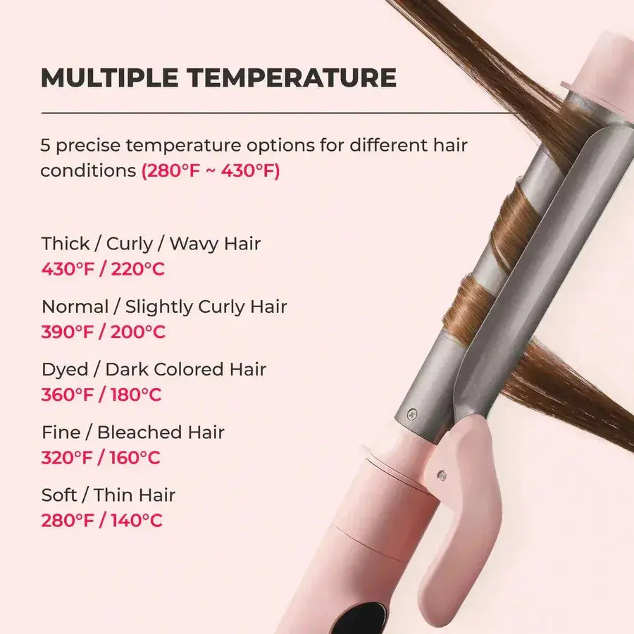 “Select, Swap, Create!” TYMO CUES comes with 3 premium ceramic barrels (0.5 / 1.0 / 1.5 inch) so you can show your versatility no matter where you are, from a bob to beach waves to a swooping fringe. Unleash silky effects and eliminate frizz fast with a high quality coating that releases millions of negative ions to smooth hair and avoid damage. As soon as you select your iron size, plug it in and power up, 5 temperature settings from 280℉ (140℃) to 430℉ (230℃) handle all hair types and styling desires while keeps you safe with a 60-min auto off feature. An advanced NTC control system with a gold-plated internal wire provides precise temperature control as you style and shape your hair. The 3 in 1 set is ideal for travel: the full purchase includes a curling iron with 3 interchangeable barrels, a protective glove, 2 hair clips and a premium leather bag to help you prep on-the-go. The LED display will show the Fahrenheit or Celsius degrees according to your plug-in voltage. TYMO CUES will prove to be a true friend as you meet your hair styling needs when traveling around the world!