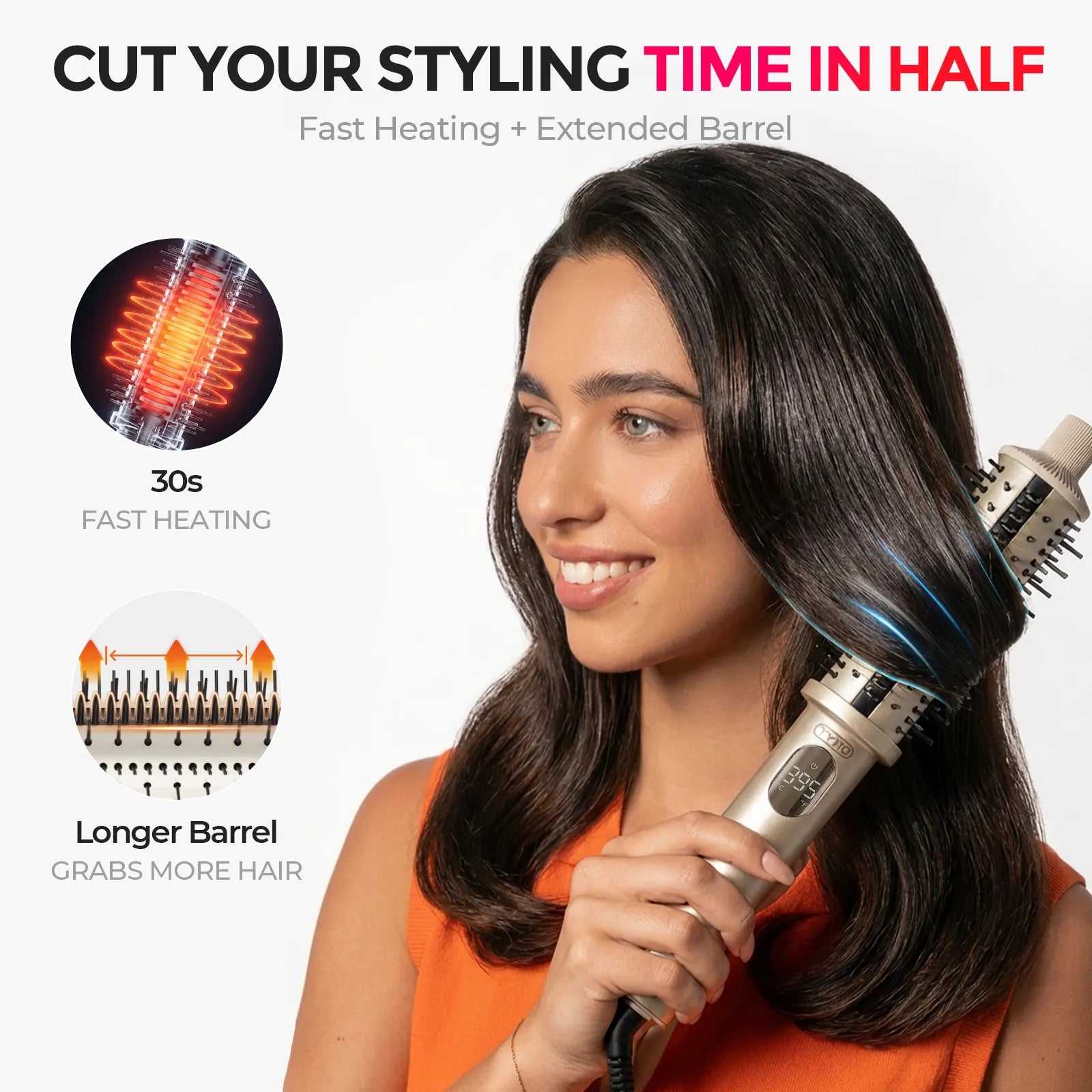 Powered by 70W PTC heating technology, the brush reaches your desired temperature in just 60 seconds. Five adjustable heat settings (250°F–395°F) with a real-time digital display let you customize the perfect heat for your hair type. The intelligent memory function saves your last setting, while an automatic 30-minute shut-off keeps styling worry-free.